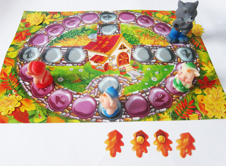 Три поросенка от Русского стиля была куплена давно и ... забыта. Большую коробку выбросили, резиновые волк и поросята обитали в коробке с остальными зверюшками, только поле и кубик были на полке с настольными играми. И вот как-то наткнулся взгляд на этот немаленький кубик и игра была сыграна. Очень хорошо пошла. Эту сказку Дима любит слушать.