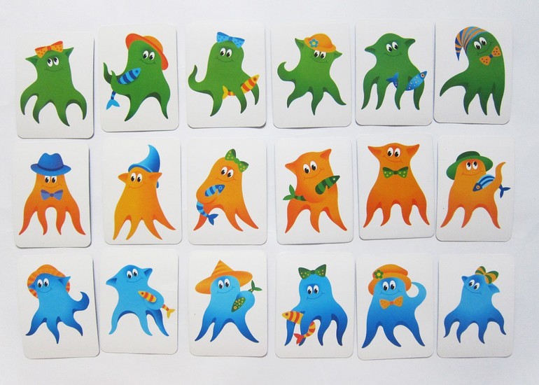 Начали осваивать игру Веселые осьминожки. Чудесная игра, с удовольствием ее рекомендую. Сейчас ее в продаже не найти, но pnp точно есть. В колоде всего 36 карт. В правилах два варианта игры, а в Интернете видела еще несколько. Мы играем в "найди монетку". Под одним из 18 осьминожков прячется монетка и игроки должны угадать под каким, задавая вопросы ведущему, на которые он может ответить только "да" или "нет".