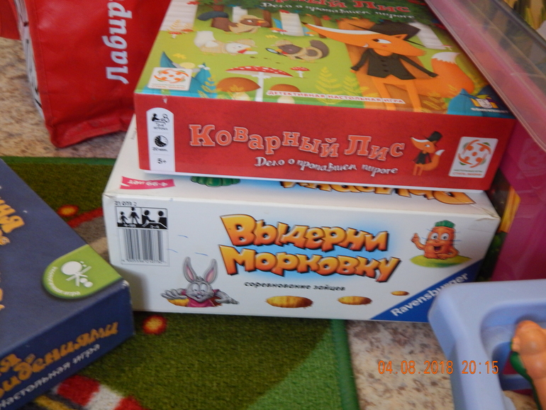На день рождение к нам приходили детки, конечно же, без настолок не обошлось. Хитом стала бесспорно «Кукарача», следом «Выдерни морковку», за ними «Башня с привидениями» и лишь на последнем месте «Коварный лис» - дешифровщик особого восторга не вызвал.