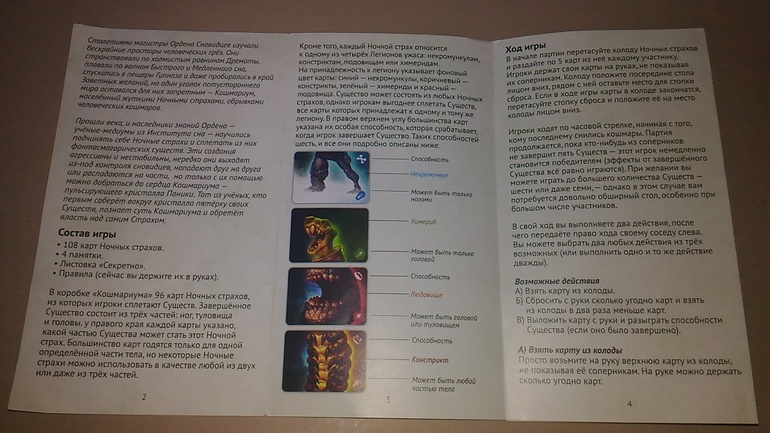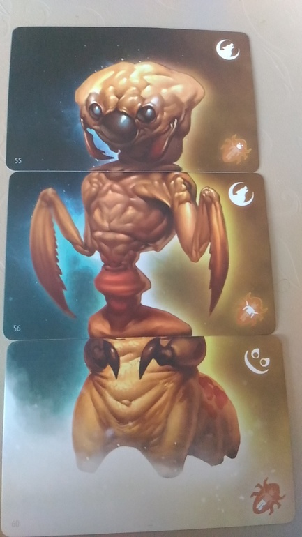 на примере мы видим, что игрок должен забрать любую верхнюю карту чужого существа у любого игрока, затем откроет две карты из колоды и если это будут ноги и туловище сможет сразу выложить это существо, а затем положить любую карту с руки, при наличии карт можно создать новое существо.