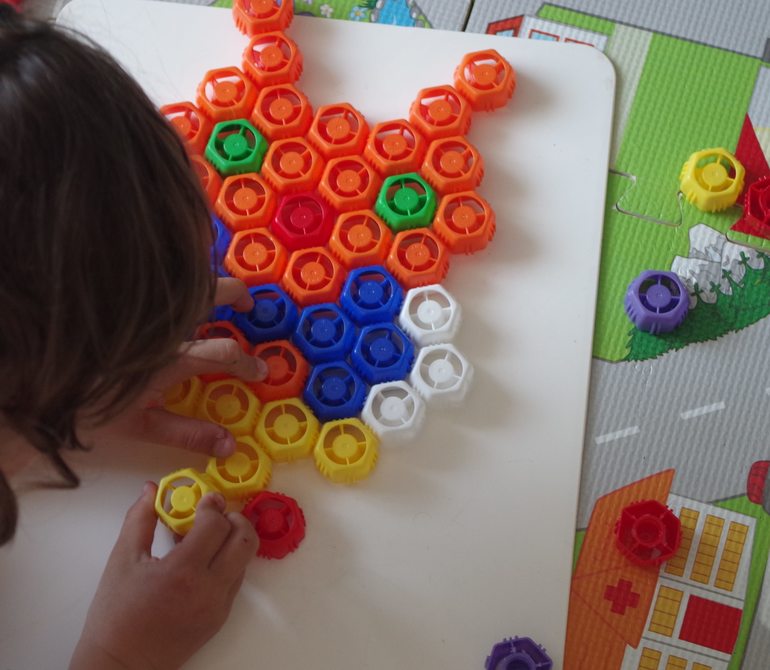 Мы уже не строим из нее, а придумываем всякую всячину. Вот например, большой компанией в скоростные колпачки, или скрепляю ряд из 10 цветов, а дети по образцу свой ряд делают. И посложнее: делаю ряд, показываю несколько секунд и прячу. Детям надо по памяти сделать такой же цветовой ряд.