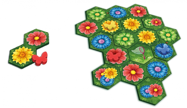 Каждый игрок собирает свою клумбу из двойных тайлов цветов. Победные очки даются за поляны с бабочками на вашей клумбе - области одного цвета. Для каждой поляны число цветов умножается на число бабочек.