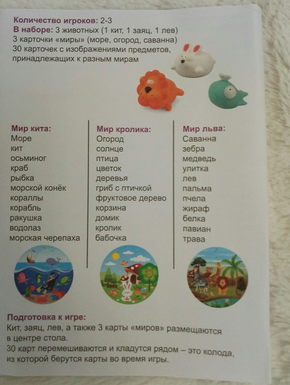 По основным правилам зверушки стоят отдельно, карты "Миры" отдельно, берем маленькую карточку из колоды, определяем к какому миру она относится, быстрее хватаем нужную зверушку и ставим на нужный мир.