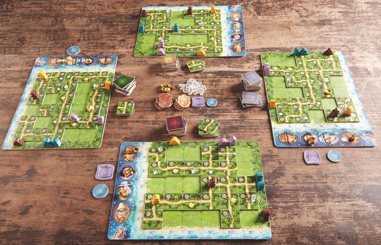 Вот и опять я со своими нездоровыми ассоциациями. Да-да, мне кажется, тем, кто жалуется на то, что в Пэчворк можно играть лишь вдвоём, просто надо купить Карубу (хотя, это, конечно, недешёвое удовольствие). Конечно, они разные, но отдельные планшеты и разветвляющаяся сеть тропинок, которые надо расположить нужным образом, постоянно наводит меня на мысль о лоскутных тетрисоподобных фигурках). Правда, здесь не будет иметь никакого значения сколько "дырок" вы оставите в травяном покрове своего острова, зато неразумными действиями можно загнать своих исследователей в тупик и никогда не достигнуть древних храмов, сулящих баснословные богатства.