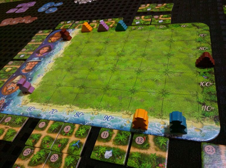 Каждый игрок получает свой планшет и расставляет человечков (на пляже) и древние храмы (в джунглях). Начальная расстановка должна быть одинакова для всех игроков, но от игры к игре она, конечно, будет меняться. Каждый игрок (кроме главаря) окружает себя рядами и колоннами пронумерованных квадратиков с тропинками, а главарь складывает свою порцию таких же квадратиков как у всех остальных в плотный тканевый мешочек (который он заранее сшил, потому что в коробку, увы и ах, производители его не положили… бяки!).