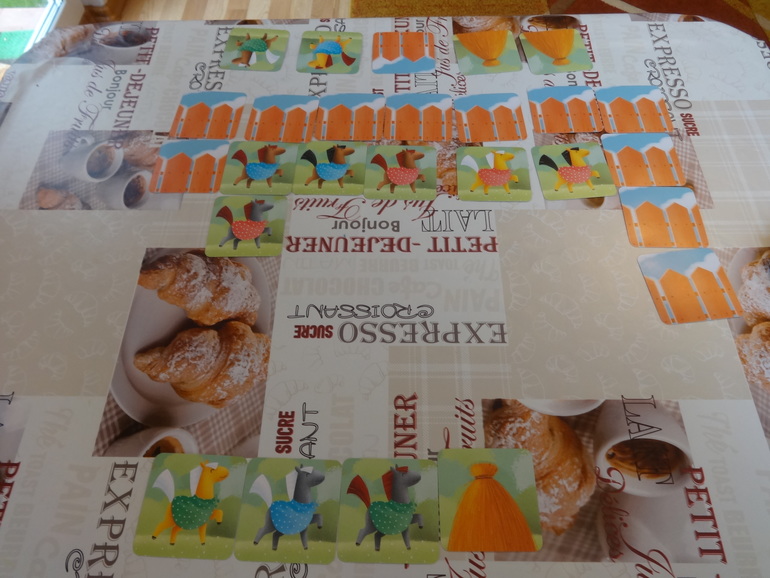 Каждый ход начинается с того, что игрок должен выложить все свои заборы. Только после этого можно выложить трех пони, или, если трех пони с одинаковым признаком нет и попросить не у кого, вместо трех пони, можно выложить один стог сена. Выложен заборы и три пони с коричневым тельцем:
