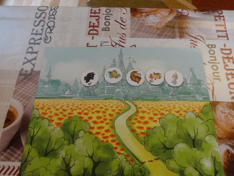 Первоначальный расклад. Все персонажи стоят возле упавшего на Гингему домика Элли. Бастинда, она же песочные часы, стоит на старте, рядом лежит карта заклинаний с жетоном: