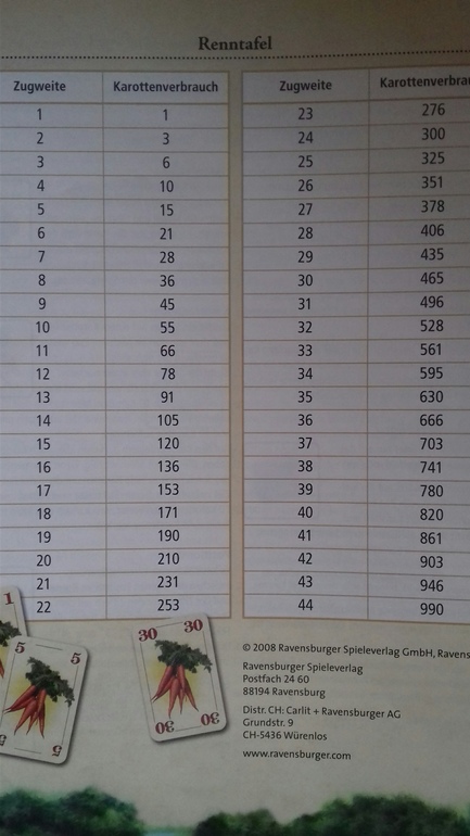 Это была бы самая простая гонка-ходилка, если бы за каждый ход не приходилось платить. Пошёл на 1 ход - плати 1 морковку, на 2 хода - 3 морковки, за 3 хода - 6 и так далее. Получается чтобы сходу выиграть гонку вам понадобится больше тысячи морковок, а т.к. на момент начала игры у каждого игрока (а игроков может быть от 2х до 6ти) их только по 68, то приходится как-то выкручиваться.