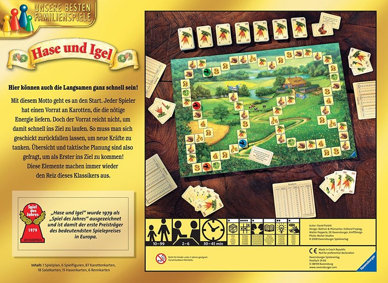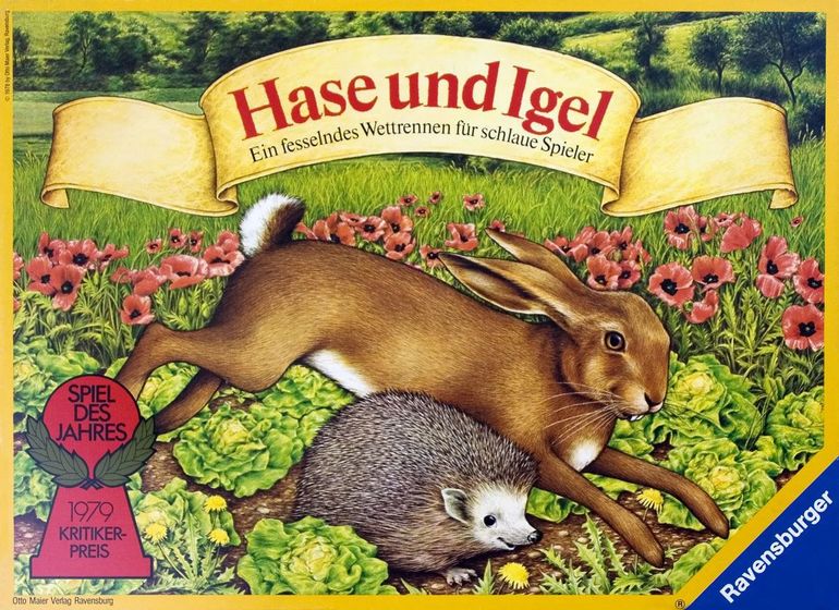 Не знаю точно, когда эта игра была изобретена, но то, что в 1979 году она завоевала какую-то награду означает, что ей уже не меньше 40 лет. За эти годы она выдержала множество переизданий, сменила кучу обложек, полей, а медленная черепаха мутировала в достаточно быстроногого ёжика.