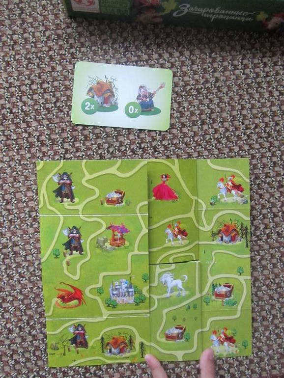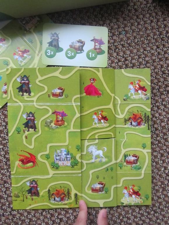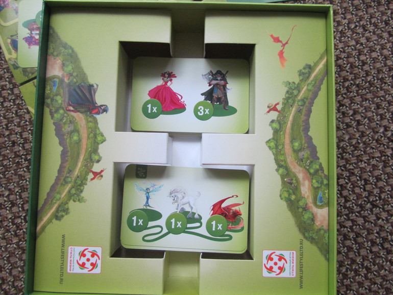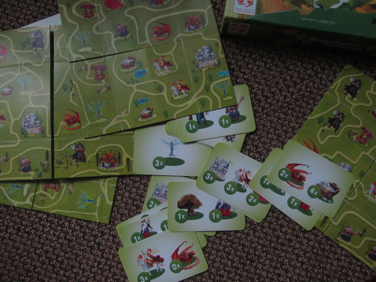 В коробочки четыре планшета и карточки двух уровней сложностей, вверху карточки, где нужно просто сложить картинку, чтобы на поле было строго столько персонажей как на карточке