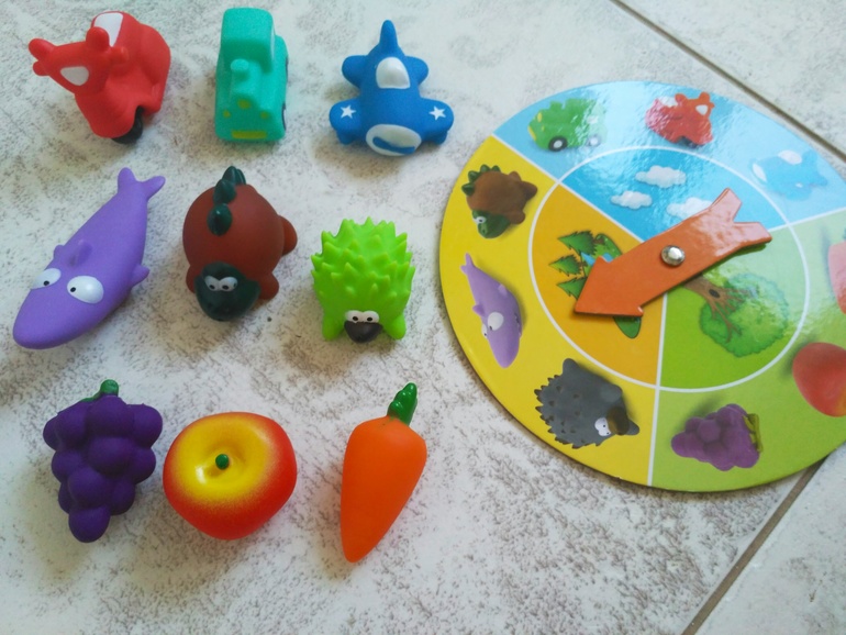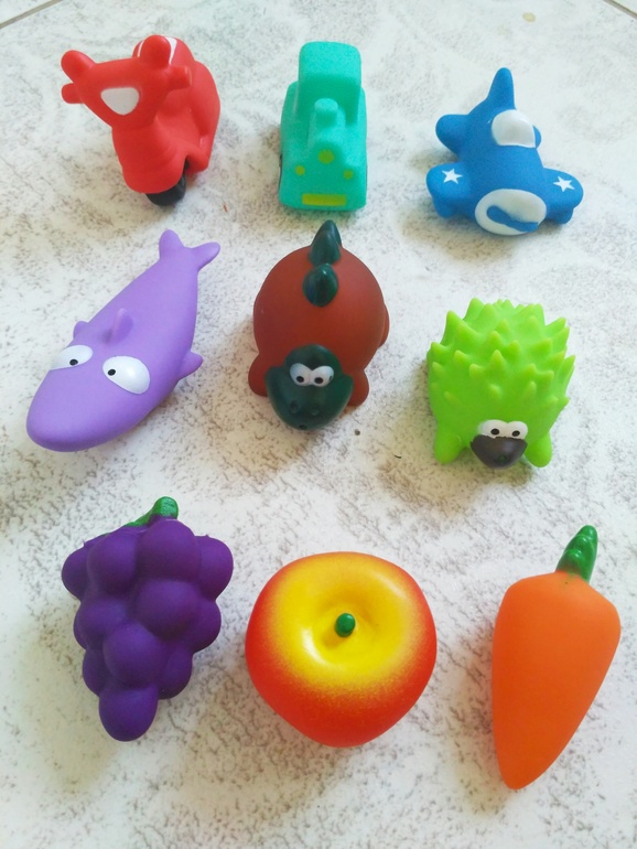 Сами резиновые игрушки приятные на ощупь, очень нравятся овощи фрукты, недоумении вызывает группа "Животные", на картинке она больше похожа на Лес, но в лесу нет акул))