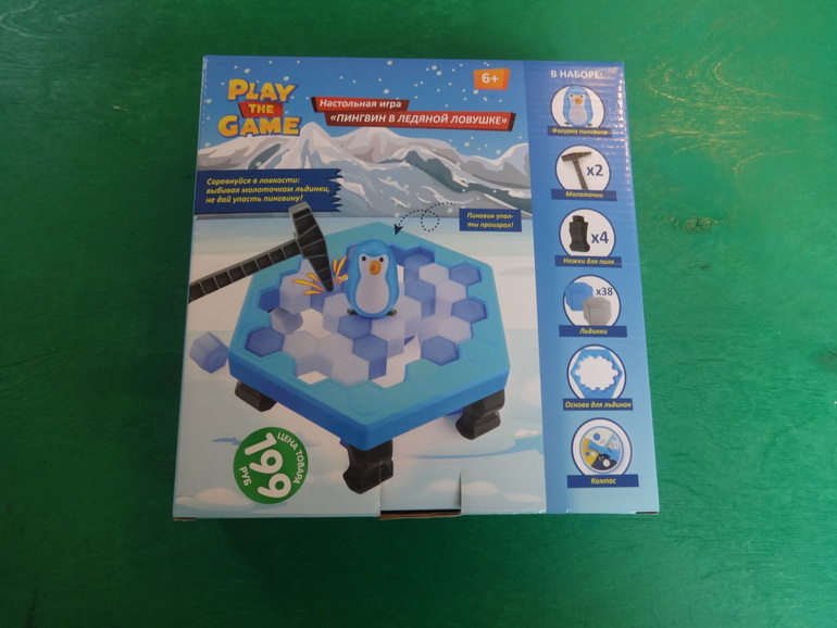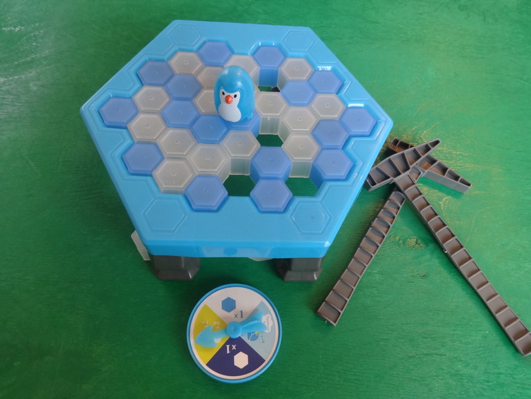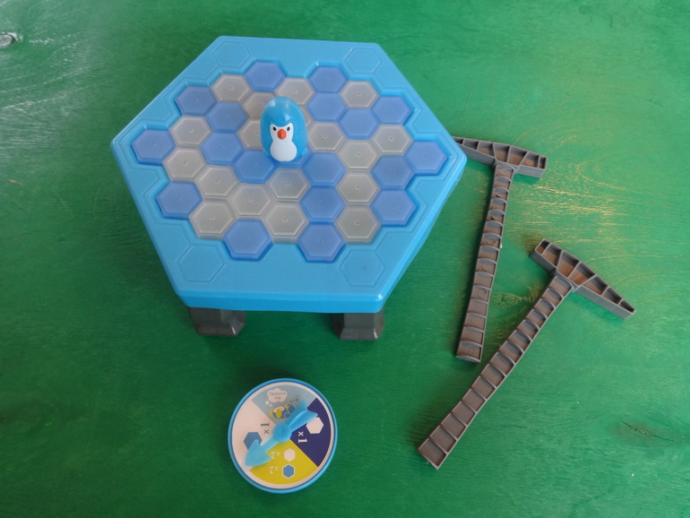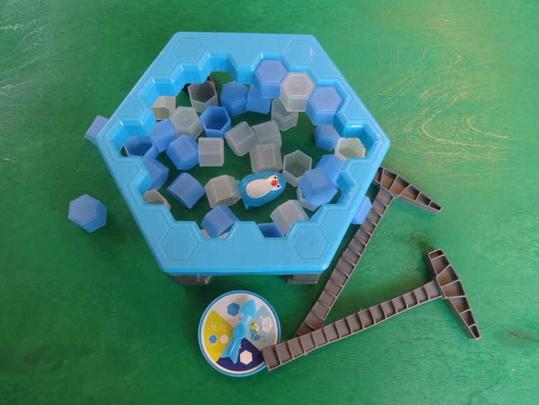Раскладка перед игрой. Все льдинки собраны на поле, пингвин поставлен в центр поля, рядом лежат молоточки, которыми вы будете выбивать льдинки согласно выпавшему на компасе значению. Проиграл тот, у кого пингвин провалится под лед.