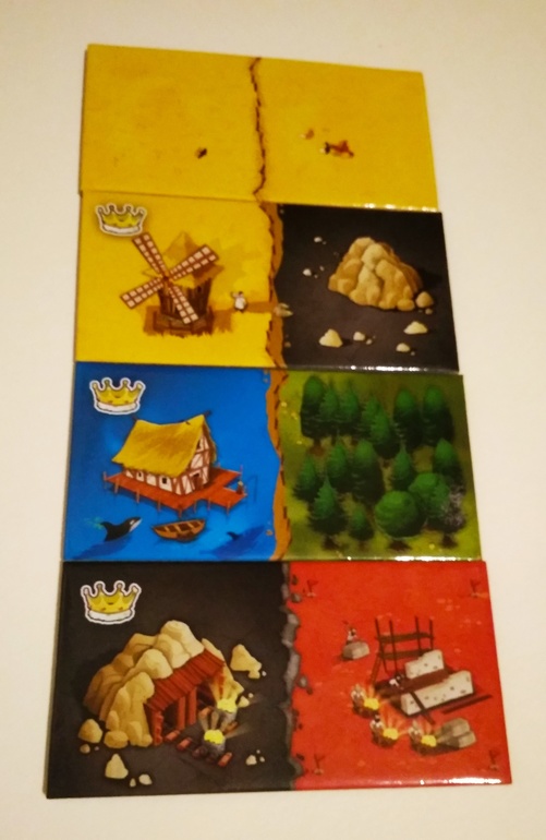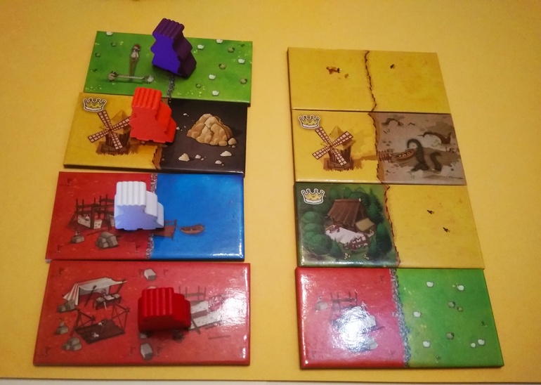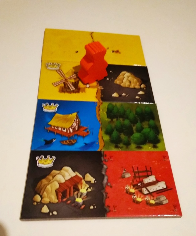 Другие игроки по очереди занимают оставшиеся. Когда все фишки стоят на участках, формируется новый ряд из 4 прямоугольников ландшафта справа. Первым ходит игрок, чья фишка стоит на верхнем участке.
