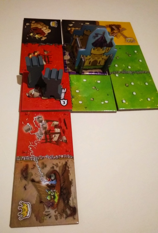 В центре стола располагается планшет "Строительство" с участками зданий и драконом в пещере. Рядом кладутся монеты, рыцари, башни и ставится фигурка королевы (она же императрица). Прямоугольные участки будущей империи тщательно перемешиваются и кладутся в коробку стороной с цифрой к игрокам.