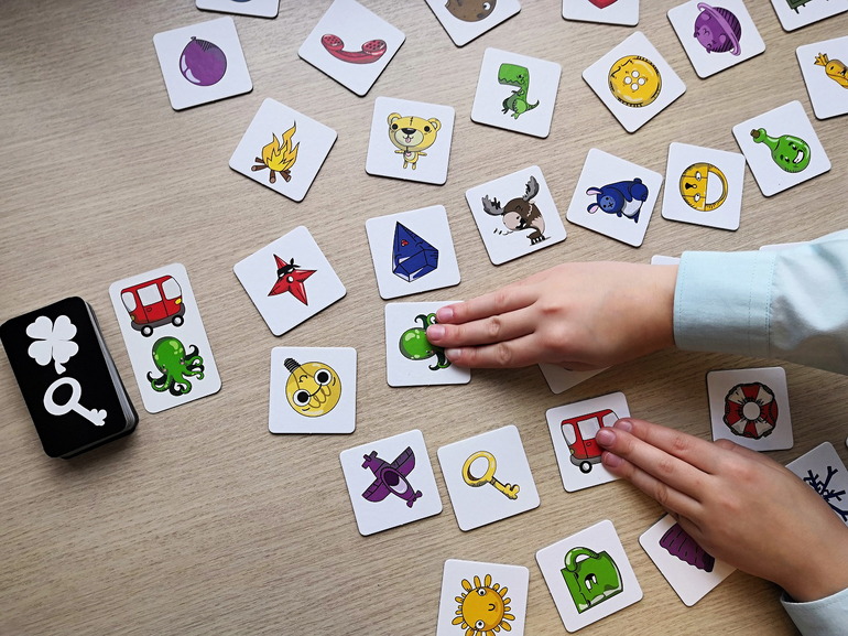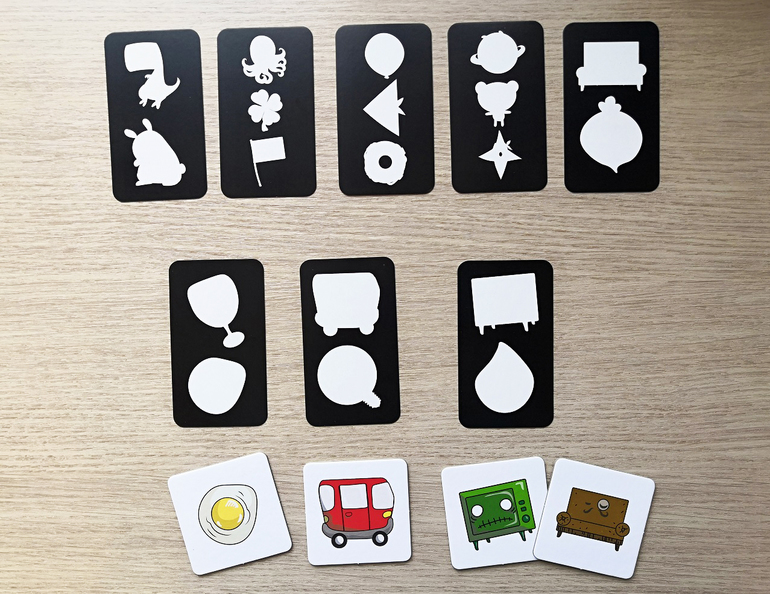 Карточки с заданиями также двусторонние. На них изображено 2 или 3 предмета/cилуэта.