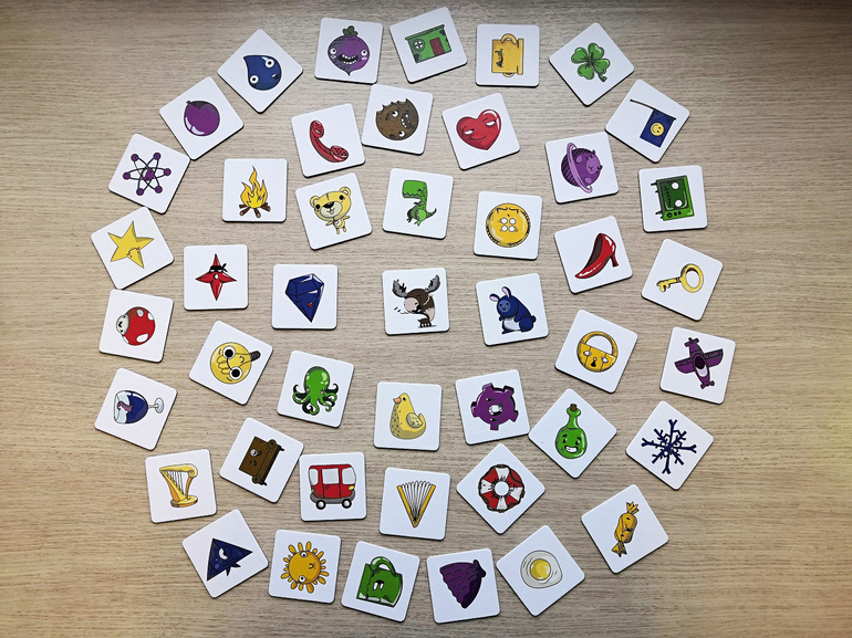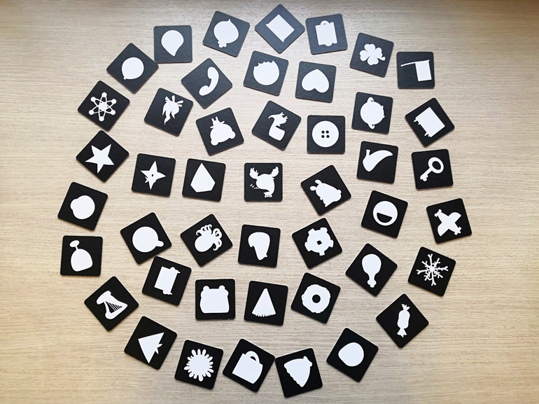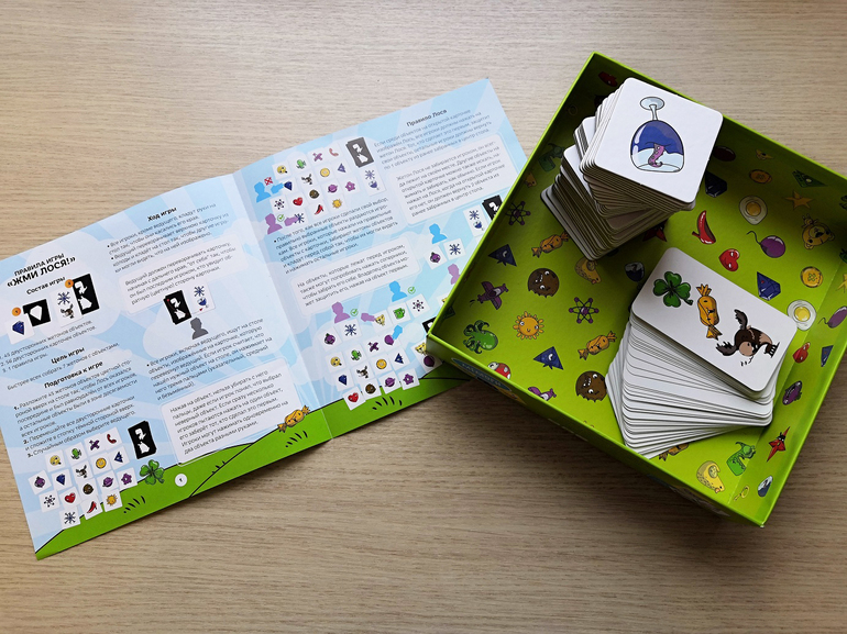 В яркой коробочке правила игры и две колоды: 45 плотных "неубиваемых" жетонов с изображениями и 56 карточек с заданиями.