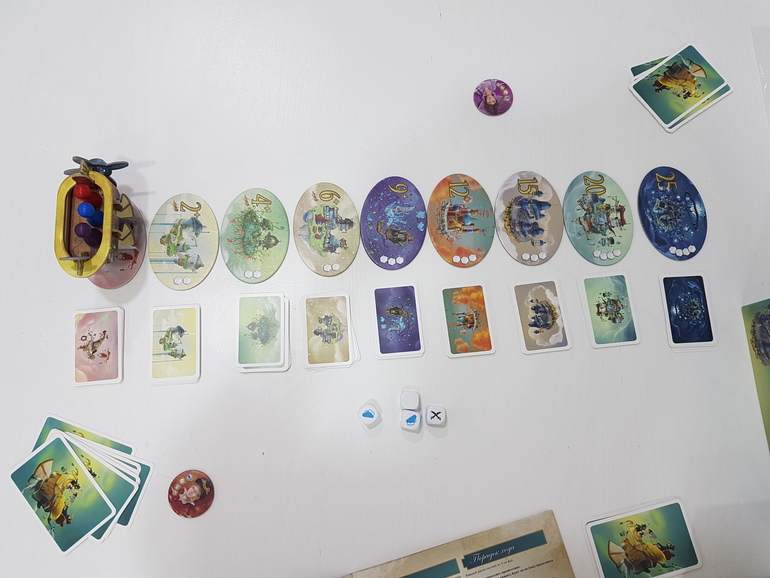 Подготовка простая - достаточно выложить тайлы, карты снаряжения и сокровищ и поставить "летучий корабль" с путешественниками в первый город.