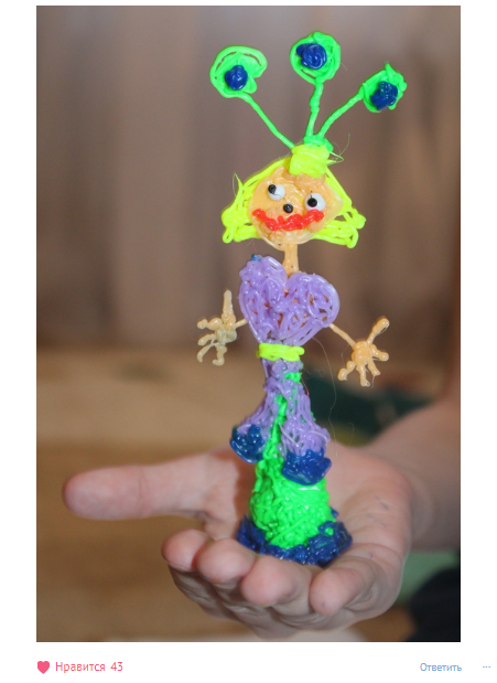И, наконец, объявим результаты голосования. Лучшими работами вы посчитали работу Ирины (8 лет), выполненную в необычной технике - 3D ручкой (43 голоса).