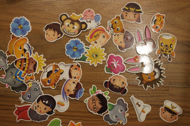 Как видите, нам привезли конструктор в большой и красивой коробке. Состав конструктора: 24 гибкие палочки разных цветов, 60 креплений, 4 колеса, большое количество картонных ламинированных рисунков, на которых изображены цветочки, лица людей и мордочки животных (на фото можно посмотреть как они выглядят).