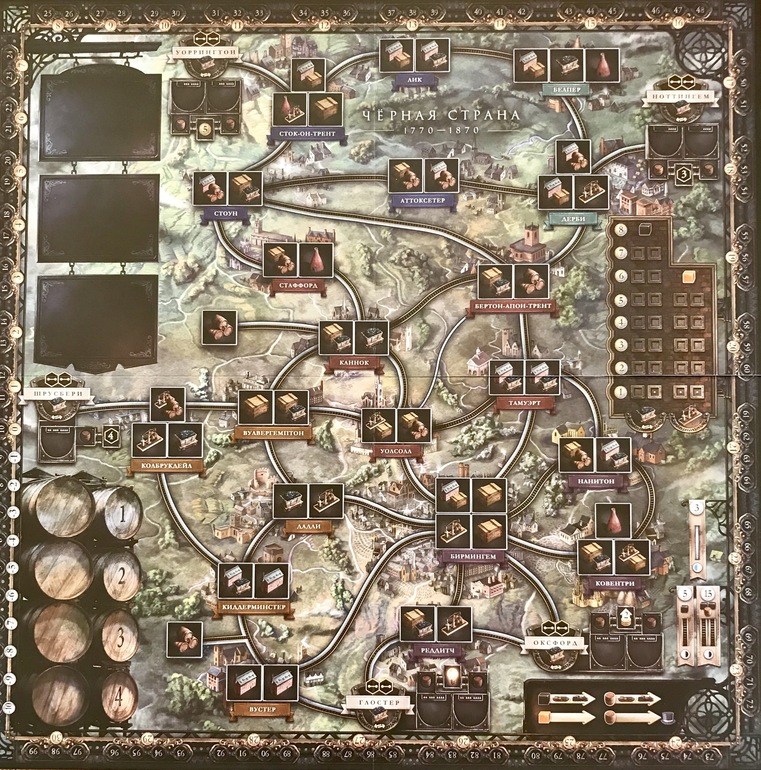 Не буду рассказывать ход игры, это будет долго и все равно не очень понятно. Основной мотив: берем карты, сбрасываем карту-выполняем действие (строим производство; прокладываем транспортную сеть; продаем производство; модернизируем, перестраиваем; берем джокера, или пасуем). В свой ход можно выполнить два любых действия, сбросив две карты. За выполненные действия получаем баллы по шкале дохода, доход будем получать в конце каждого раунда после того, как все игроки завершат свои ходы. В конце эпохи получаем баллы победных очков. У кого на конец двух эпох больше всех победных очков, тот и победил! Написала очень поверхностно, поверьте, всё весьма глубже.