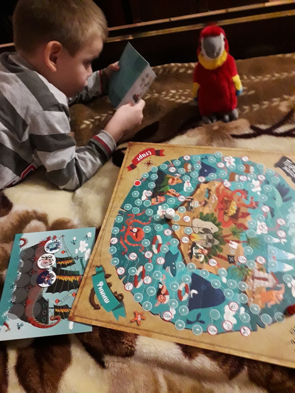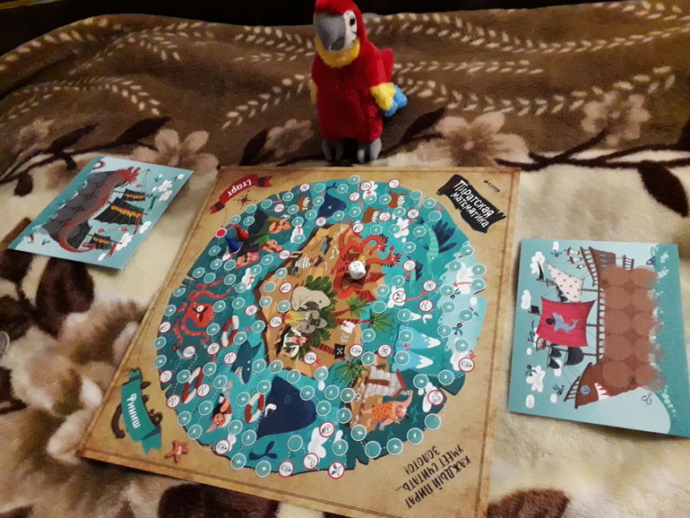 Попугай у нас не кричит "пиастры" ))). Он у нас даже не специально для этой игры. Это Санина игрушка-друг. Кеша везде с нами ).
