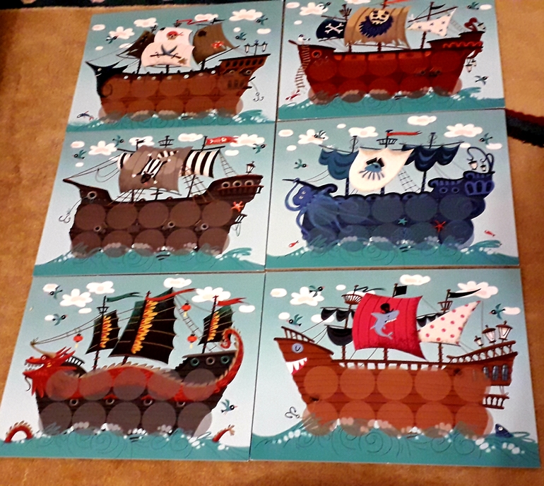 Вот все планшеты кораблей, на которые надо собирать пиратов. Как видим, играть можно компанией до 6 человек.