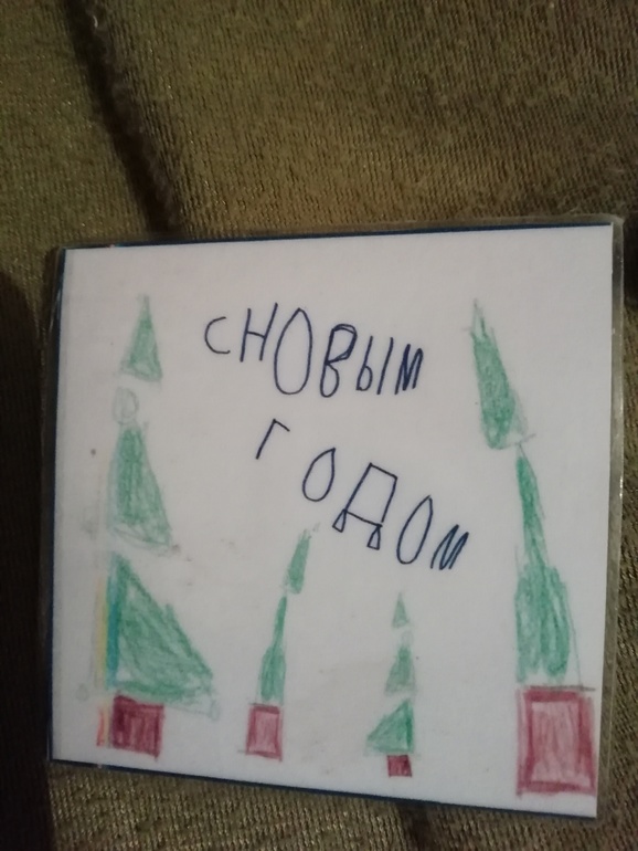Самая первая наша Новогодняя игра была создана на волне дочкиной любви к наклейкам в 3 года, хотя любовь эта так и не прошла за 6 лет. Попались мне тогда дешевые наклейки в оптовом магазине на соответствующую тему, щедро усыпанные блестками так, что и изображение не всегда угадывалось. Глиттер мы немного очистили, но его еще оставалось достаточно, чтобы одинаковые наклейки не сразу находились. Я попросила дочку нарисовать елочки, показала как, и попросила списать надпись «С Новым годом!». А потом отсканировала рисунок и распечатала квадратные карточки. Получилось так: