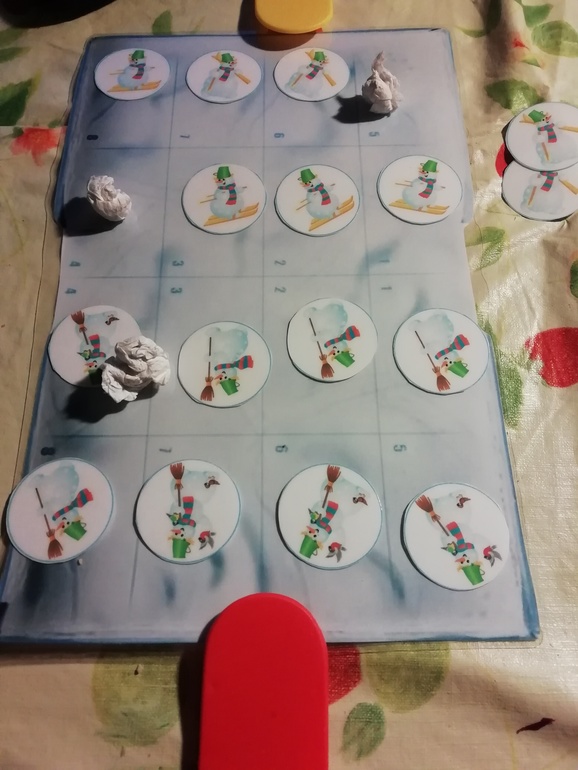 . Вспомнили, что там вроде снеговики должны быть и в них стрелять чем-то нужно. Взяли из судоку, которые я описывала во второй части, картинки со снеговиками - получили команду снеговиков с лыжами против команды снеговиков с метёлками. В качестве катапульт взяли катапульты из «Летающих колпачков», в качестве снарядов - «снежки» из салфеток, порезанных на 4 части.