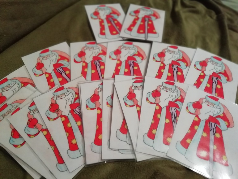 Итак, как я ее делала. Нашла подходящую раскраску, распечатала карточки по 4 штуки на листе А4, а потом начала раскрашивать. Одного Деда Мороза раскрасила, как образец, а вот остальных красила так, чтобы с образцом было одно отличие: либо в цвете раскраски, либо в присутствии/отсутствии какого-либо элемента. Получилось 20 карточек. Конечно, я их все заламинировала и обрезала уголки. Если убрать образец, то между двумя любыми карточками существует ровно два отличия. Кто их находит, забирает одну карточку себе. Потом я еще одного Мороза раскрасила в точности, как образец, и подсунула в игру с заданием найти двух одинаковых дедов. Дочка справилась минут за 15. И потом еще несколько раз искала их, но поняв, где искать отличия, делала это быстрее. Поскольку отличия на картинках не сложные, то игра не будет долгоиграющей. Будем ли играть в этом году, посмотрим. Я понимаю, что можно было всё рисование-раскрашивание сделать в какой-нибудь компьютерной программе, но это не моё. А вот пораскрашивать, когда дочка спит, да еще отличнейшими карандашами, было приятно.