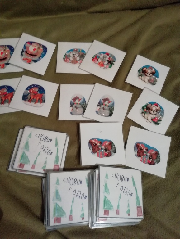 Только не подумайте, что мой ребенок так все прекрасно сразу нарисовал! Нет, конечно. Я вообще еще два года назад думала, что даже мизерных художественных способностей Бог ребенку не дал вообще, но потом как-то все сдвинулось, и сейчас Чудочка моя рисует в некоторых случаях более чем хорошо, поражая нас порой своей необычной фантазией. Ну а тогда мне пришлось вырезать в Paintэти ёлочки, нарисованные в разных частях листа, стирать лишнюю закраску, выходящую за пределы не только ёлочек, но и листа бумаги, и значительно уменьшать надпись, а потом это всё соединять в один рисунок по размеру квадрата. Квадраты распечатала, вырезала, и вручила ребенку вместе с наклейками. Работы хватило на два вечера дочке и еще на 4 мне, так как потом я квадраты ламинировала, снова вырезала и скругливала края ножницами (не было тогда еще у меня аппарата специального), а потом и правила разных игр с этими карточками печатала.