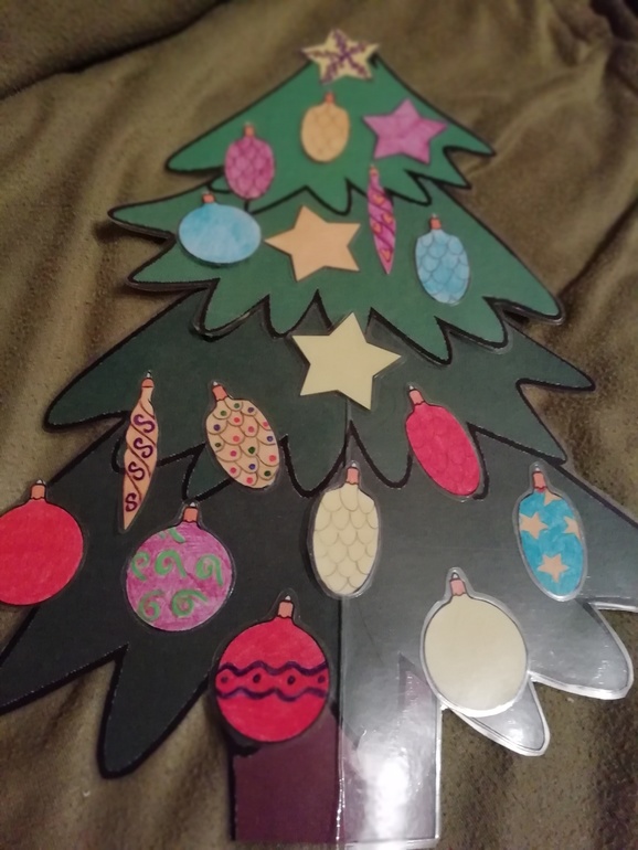 Не могу точно сказать сама или нет. Любит она смотреть обзоры настольных игр от «Игроведа», влюблена в одного из ведущих (вот я плохая мамаша: ребенок влюблён, а я даже не пытаюсь уточнить личность выбранного объекта J). Может там идею и подхватила. Называется игра «Наряди ёлку». Для реализации распечатала ёлку: взяла раскраску и в Paint ее раскрасила. Ёлка у нас из двух частей, так как печатали на листе А4, и чтобы в коробку влезала. Естественно, заламинирована. Скрепляются детали пластилином, на него же крепятся и игрушки.