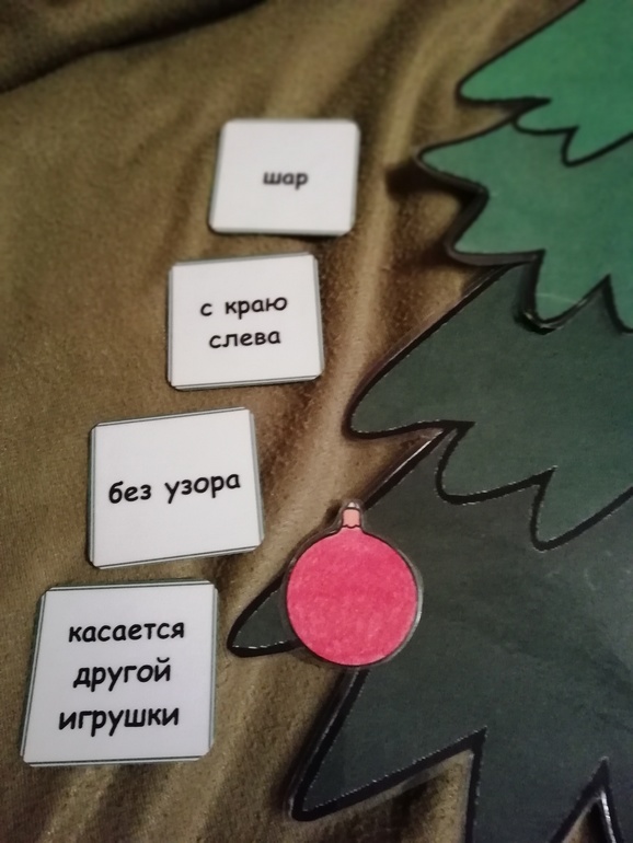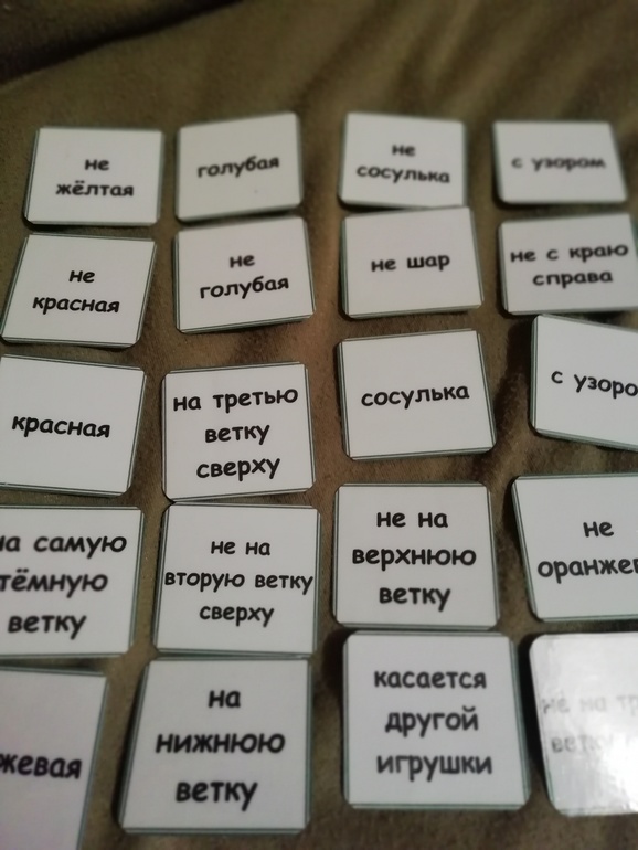 А еще карточки придумали штук 60 с противоречивыми надписями: сосулька/не сосулька, шар/не шар, …, желтая/не желтая, …… с узором/без узора, на верхнюю ветку/не на верхнюю ветку, …., на самую темную ветку/не на самую темную ветку, …, на ветку, где уже есть/нет игрушки, …