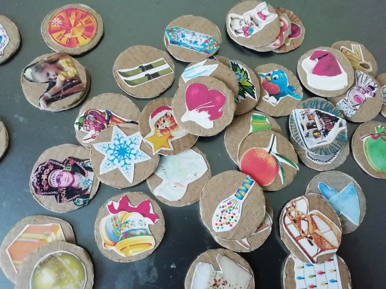 По одному листу использовали, соединили все кружки вместе и играли в игры, которые я уже описала в начале. Потом посочиняли истории, доставая фишки с картинками из дедморозовской шапки, и научили играть детей в «фишки», когда стопку кружочков надо стукнуть об стол так, чтобы они перевернулись изображением вверх. Сколько перевернулось, столько себе и забираешь. Так вот вечер встречи и прошел. Остальные фишки доделывались друзьями уже дома, а я им только правила игр распечатала.