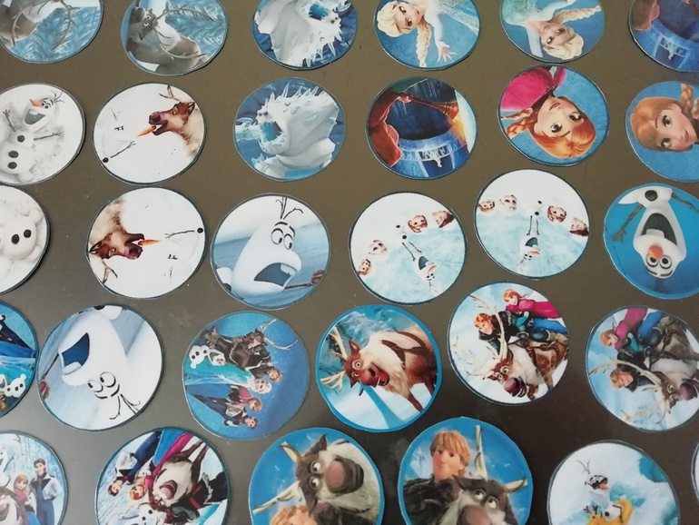 Еще раз повторили эти игры на восьмилетие дочки. Его мы делали по мотивам мультфильма «Холодное сердце». Только теперь круглые фишки я сделала с помощью компьютера на плотной бумаге и заламинировала очень плотной пленкой.