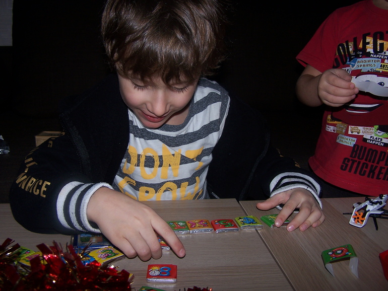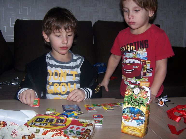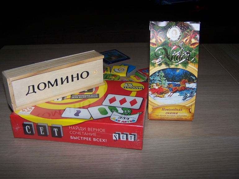 В небольшом почтовом пакете из Екатеринбурга нас ждало множество разных сюрпризов: шоколадки с буквами, магнитик Екатеринбург, пакетик чая, и две игры, которые всегда оставались у меня "за кадром". Но домино - это классика, не иметь его в арсенале никак нельзя. А об игре Сет я давно мечтала, но все никак не решалась приобрести. И вот случилось, мечта сбылась! Огромное спасибо нашей снегурочке из Екатеринбурга. Надеюсь, у нас найдется время поиграть в домино в перерывах между нарезкой салата Оливье и экскурсиями по Новогодней Москве.