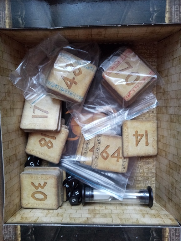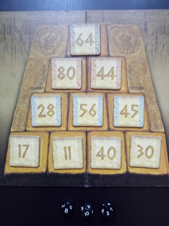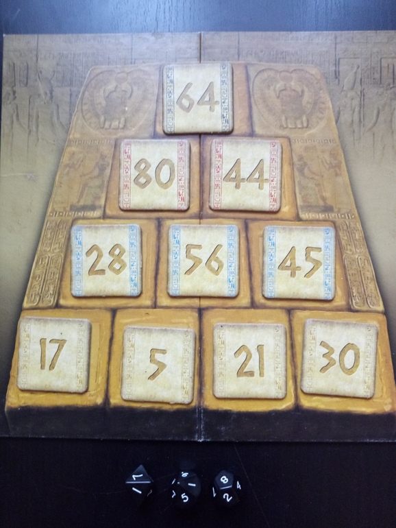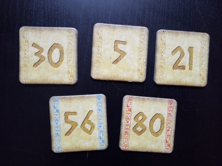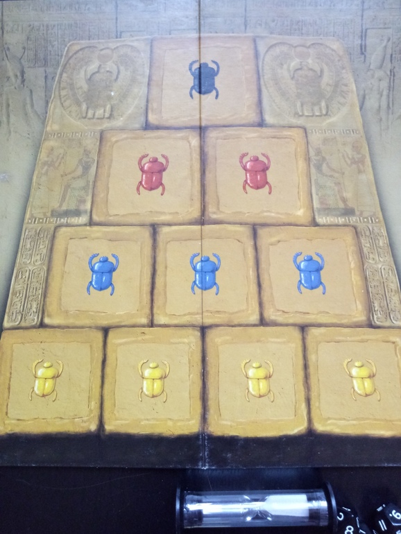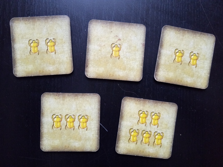 Тема фараонов немного притянута за уши, мне кажется, сюда было бы здорово добавить поле - лабиринт ведущий из гробницы фараона с фишками (эту идею мне навеял обзор Гравицапы). Тогда можно было бы переворачивать победные тайлы сразу после очередного раунда и идти в сторону выхода на количество выигранных скарабеев. Игра, соответственно, заканчивалась бы тогда, когда наружу выйдет первый участник.