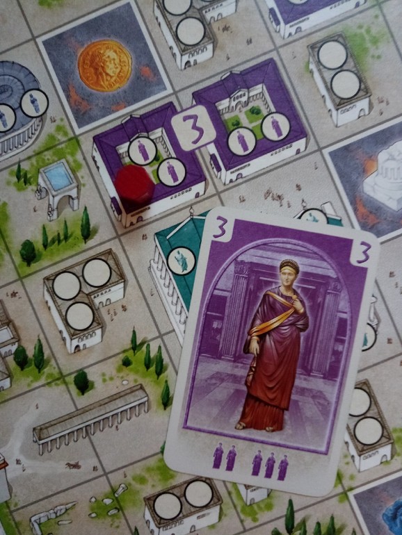 Красный играет тройку и размещает своего жителя в один из домов с номером три.