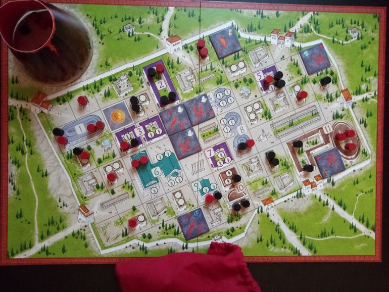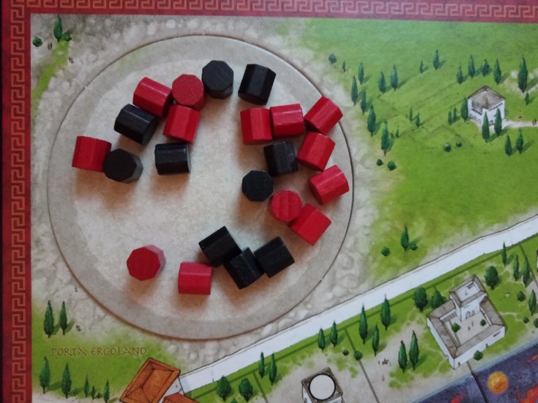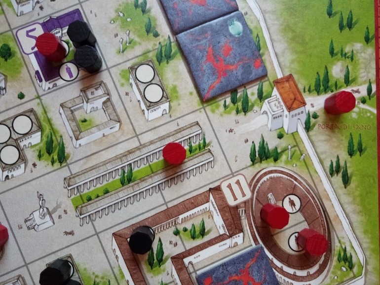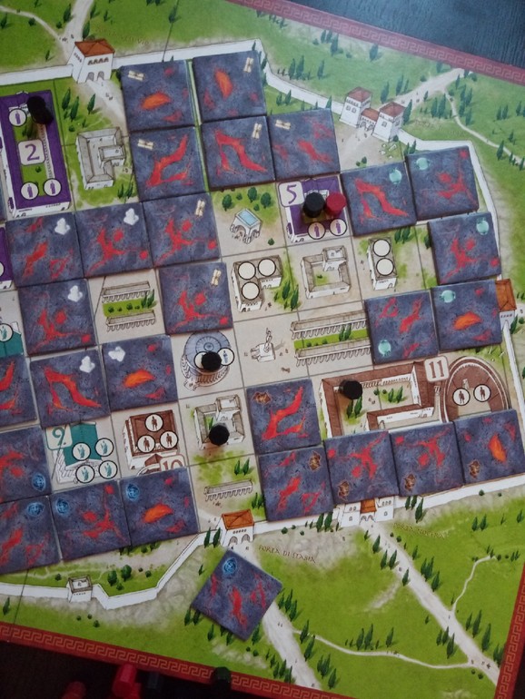 Затем игроки начинают по очереди тянуть плитки с лавой и двигать своих жителей в сторону городских ворот. Количество шагов равно числу фишек на вашей клетке, поэтому очень выгодно становится на клеточки уже занятые другими.