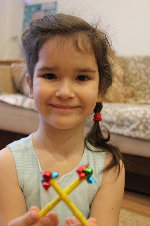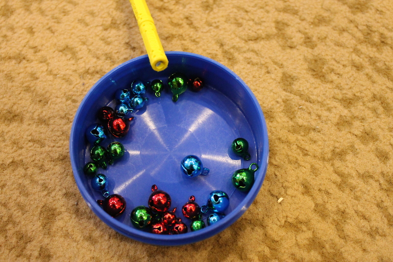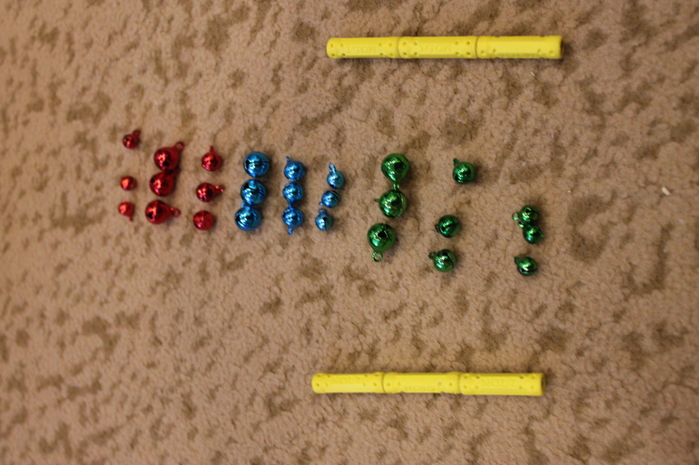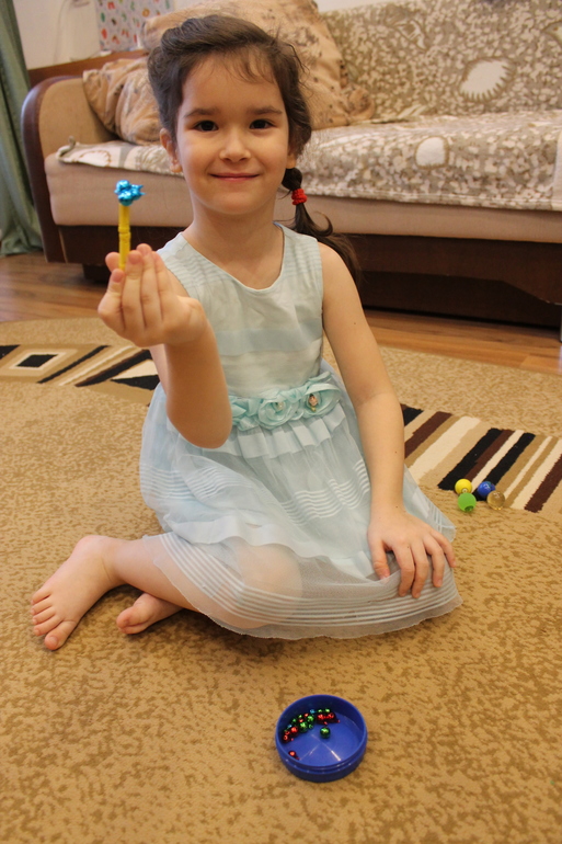 Магнитная палочка у нас из простого магнитного конструктора "палочки-шарики". Если у кого есть побольше палочка, например, из бондибоновского, то уверена, что на палочку будет цепляться больше чем 4 бубенчика, как получается у нас.