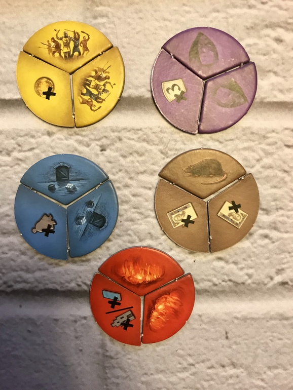 -бросаем цветные кубики и расставляем их по выпавшим значениям в порядке возрастания от 1 до 6. Каждое значение кубика и его цвет играет определенную роль. Так, за сумму всех единичек и двоек мы продвигаемся вперед по шкале репутации, которая в конце игры принесет нам ПО. Пятерки и шестерки подпортят нам картину маркерами угроз того же цвета, что и кубик с этим значением (набрав три одинаковых маркера круг угроз замкнется и непоправимое произойдет, на город обрушится чума/потоп/пожары/интриги/нашествие чужаков, за что мы поплатимся потерей всех неимоверным трудом заработанных гульденов, потерей рабочих, потерей канала или дома, потерей ПО);