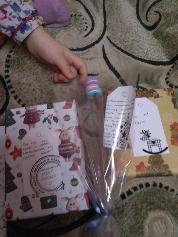 А ещё очень добрая снегурочка написала записки к подаркам( кстати очень не зря, потому что макаруни с ложки дочь попыталась съесть).