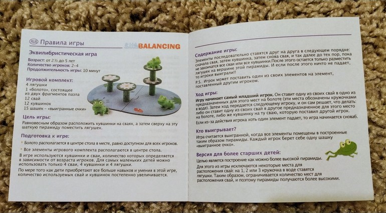 Можно строить вместе, можно соревноваться. Для тех, кто умеет считать, есть фишки, которые игрок получает, если его домик продержался до конца игры. Самый высокий дом состоит из 14 этажей (всего 14 деревянных свай), либо 4 домика разной этажности для каждой лягушки.