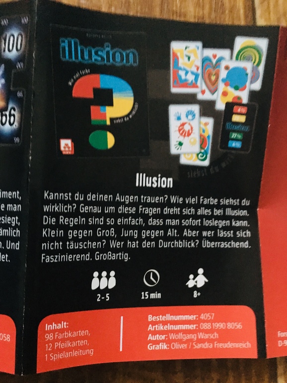 Теперь проблема понять правила, тк все на немецком только((( открыла для себя нового производителя N.s.v. Взяла игру про иллюзии, в внутри была брошюра с их ассортиментом, почти все игры визуально понравились, так что будет ещё возможность, пополню коллекцию. В них оказалось пару игр номинантов лучшие игры года - Game, Mind - следующие на очереди в моих покупках и дорастём как раз