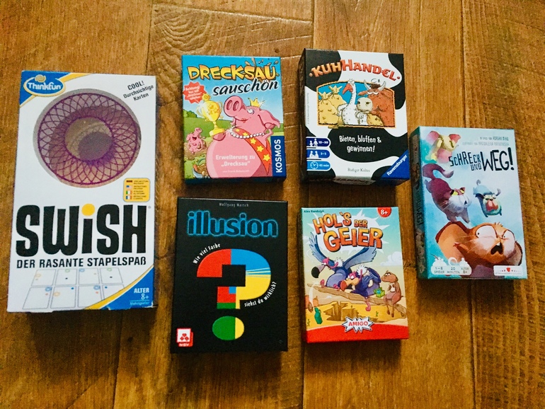 Времени было 15 мин перед от'ездом в аэропорт, мой улов вот такой, все игры компактные от 7-8 лет идут - шла специально за Swish, визуально привлекла игра Иллюзии, а остальное набрала неглядя, ориентируясь на репутацию производителя, цену и красивую обложку