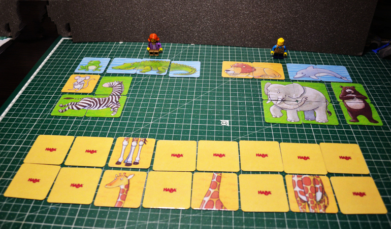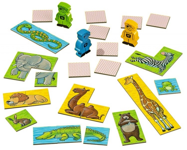 Игроки - смотрители зоопарка. Открывают лежащие кверху рубашкой карточки до тех пор, пока на карточках открывается одно и то же животное. Вот на втором фото для примера открыла жирафа. Ну и открытое полностью животное отправляется к открывшему его игроку в зоопарк. Если игрок ошибся, карточки снова переворачиваются лицом вниз и приступает другой игрок. Соответственно, у кого больше карточек в итоге (НЕ животных), тот и победил.