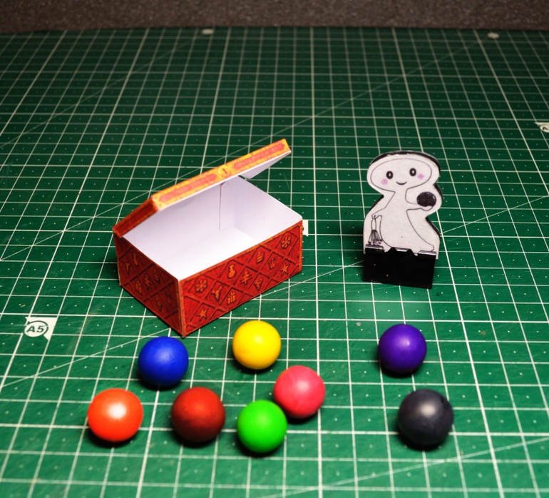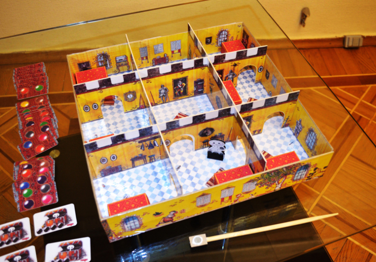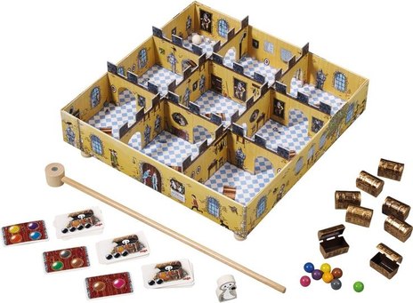 8 сундучков, в них 8 шариков разных цветов (пушечные ядра). Игрок берет карточку-задание с 2,3 или 4мя цветными шариками, затем ходит привидением по замку и открывает сундучки один за одним, смотрит цвета шариков до тех пор, пока ни ошибется. Т.е. пока не откроет шарик неподходящего цвета. Когда открыл неподходящего, сундучки закрываются обратно и ход переходит к другому игроку. А тот уже ищет другую комбинацию шариков по своей карточки.