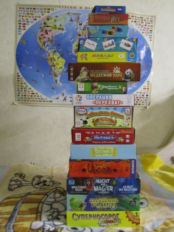 А ещё на самом верху лежит карточная игра Последний богатырь, подаренная сыну бабушкой, зная его любовь к богатырям, игра супер, сделана на основе игры Берсерк и принцип у неё такой же, чисто на двоих, сын конечно не может ещё стратегии выставлять, поэтому обычно мы играем с ним вдвоём против папы, причем папа наш всегда за нечисть играет)) Игра классная, цена более чем доступная, очень рекомендую ))