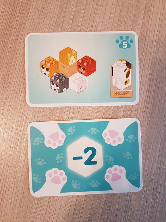 Вот мы и подобрались к сути игры. Игрокам необходимо выполнять задания, указанные на картах, располагая на столе тайлы своих котиков соответствующим образом, чтобы получилась замысловатая композиция из дружных котов. Задания первого уровня самые простые, используются только картонные котики и карта коробки. Можно заработать 5, 6 или 7 очков.