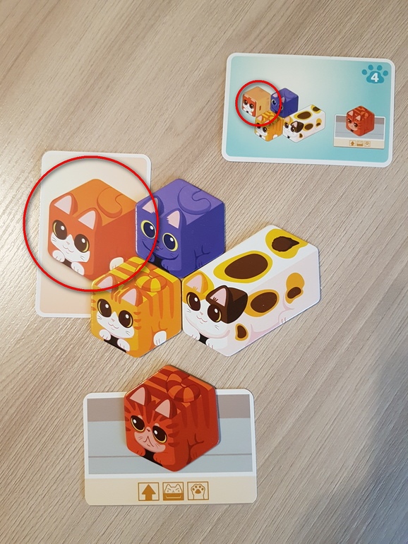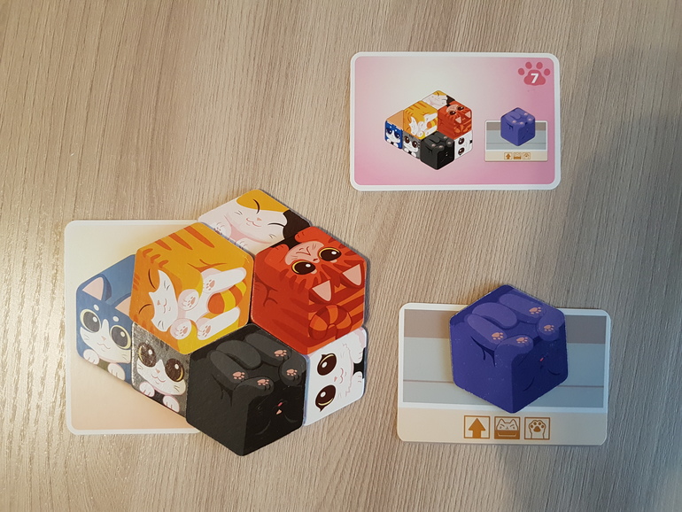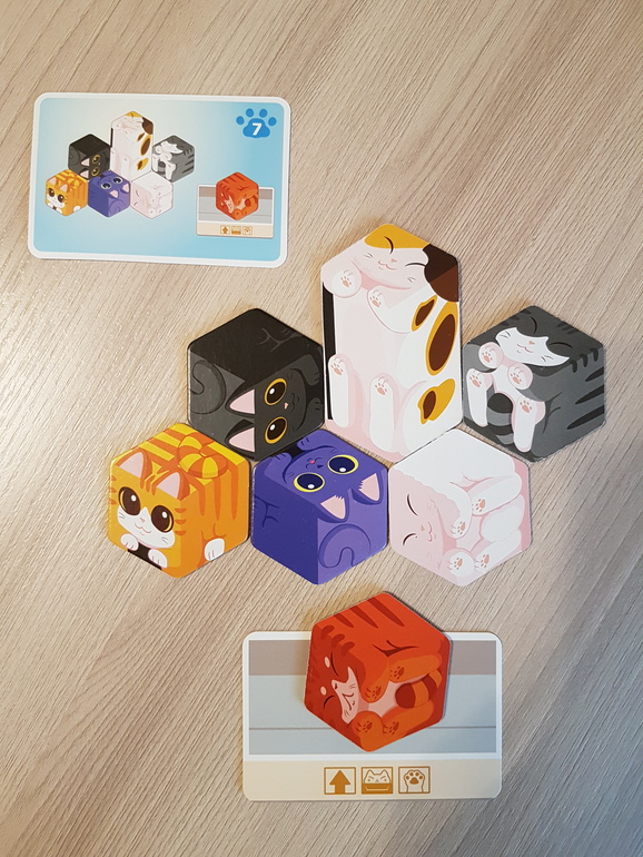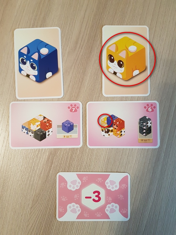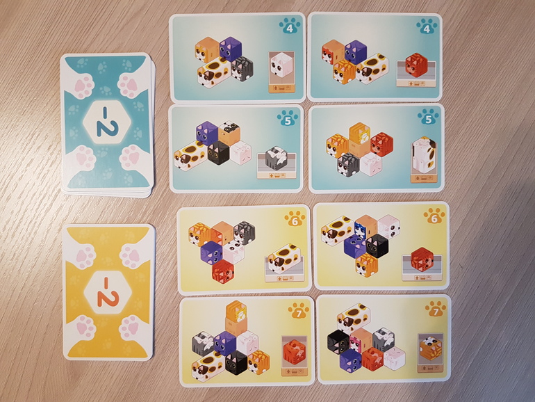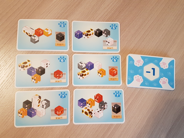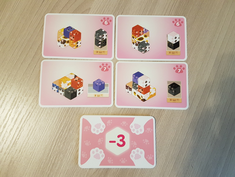 На 6 и 7 очков - посложнее. В любом случае необходимо обращать внимание, какой именно стороной выложен тайл кота - спящей или нет, как именно сориентирован относительно других тайлов, кого поместить в коробку и какой стороной при этом ее расположить - вертикальной или горизонтальной. Малейшая ошибка - и задание считается невыполненным (игра на внимательность).