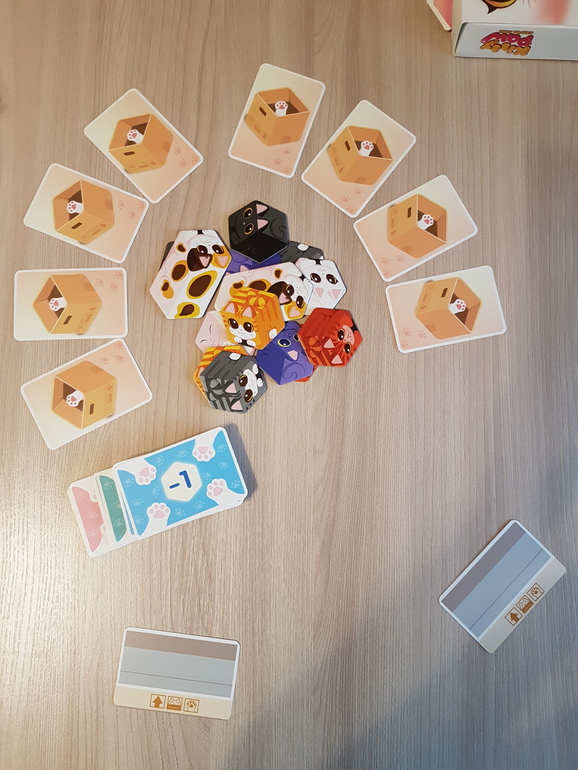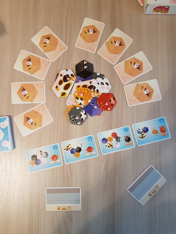 Итак, перед началом игры выкладываем на стол комплекты тайлов котиков по количеству игроков (у меня на фото раскладка на двоих), вокруг - 8 карт котов в коробках рубашкой вверх (пригодятся для второго и третьего уровня заданий), рядом колоду карт заданий, где сверху задания первого уровня, ниже второго и в самом низу третьего. Каждый игрок получает по одной карте пустой коробки.